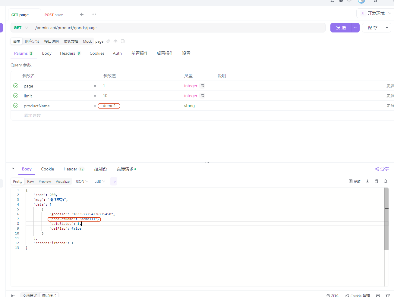 调用page接口,参数中除了分页参数,还有个筛选条件productName为demo1,String默认模糊匹配,可以看到返回的参数正确