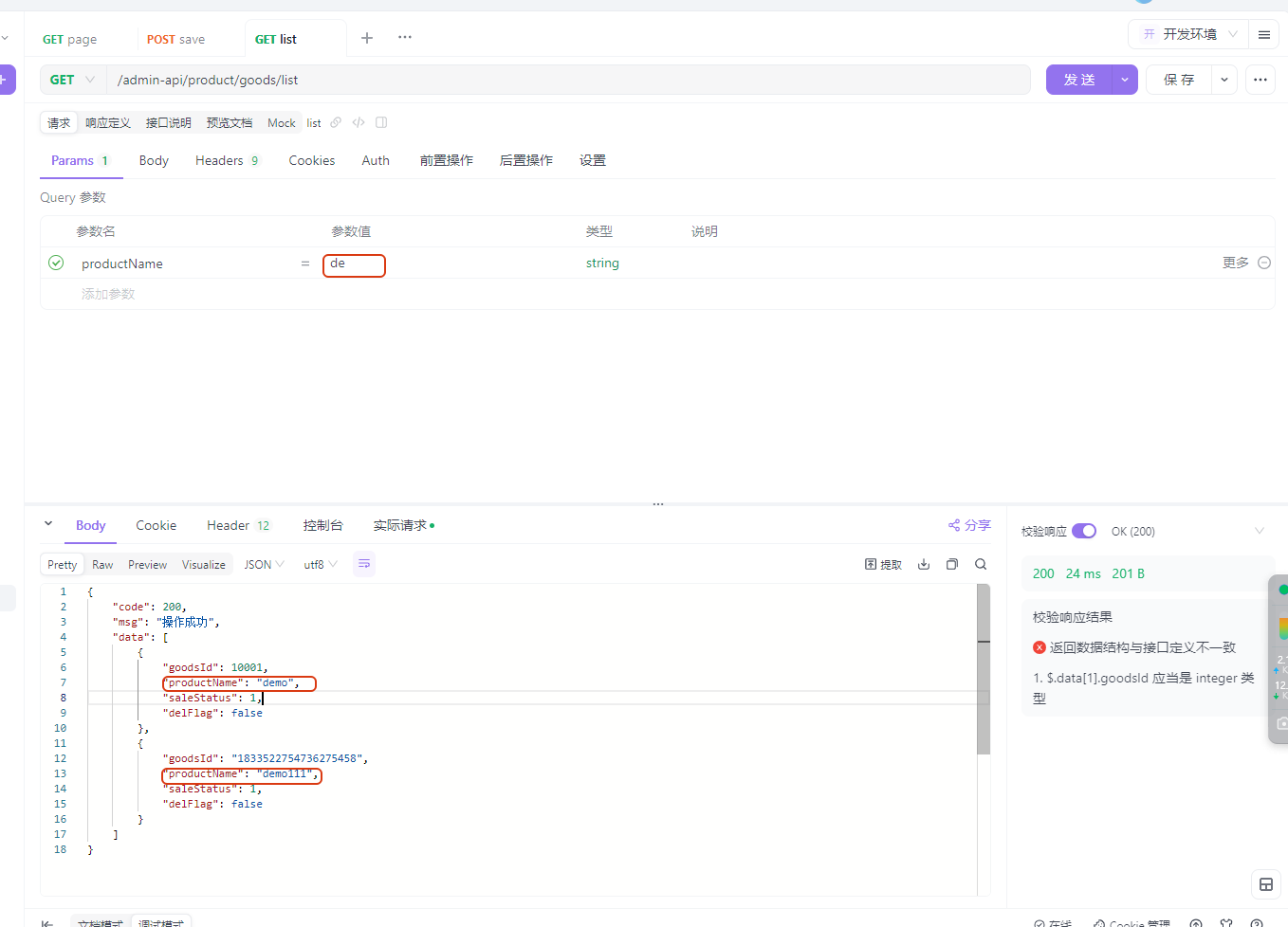 调用list接口,参数中productName为de,返回数据中有两条且都模糊匹配