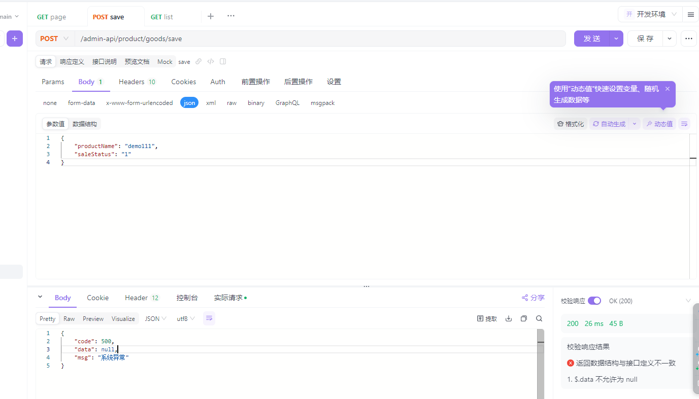 当我们调用save的时候,保存一个名称为demo111的商品,返回数据为系统异常(如下图),这是为什么呢?其实原因很简单,打开GoodsPO我们可以看到三个注解,他们的值分别对应着“不能重复标记”、“删除标记”、“状态”,用于处理一些特殊字段如唯一、逻辑删除标记、状态,这个标记可自行扩展更多功能。