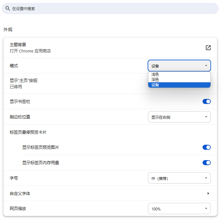 我们在使用浏览器的时候可以设置浏览器的外观(比如下图的谷歌浏览器设置),当切换外观的时候背景、按钮等组件都会有不同的展示。此时我们想要设计一款浏览器,分别有春天和夏天两种外观,当切换外观时,浏览器的按钮、文本框、组合框会有不同的展示,此时外观就对应着我们的抽象工厂,春天和夏天外观对应着具体工厂,按钮、文本框、组合框对应着抽象产品,春天和夏天的按钮、文本框、组合框就是我们的具体产品。