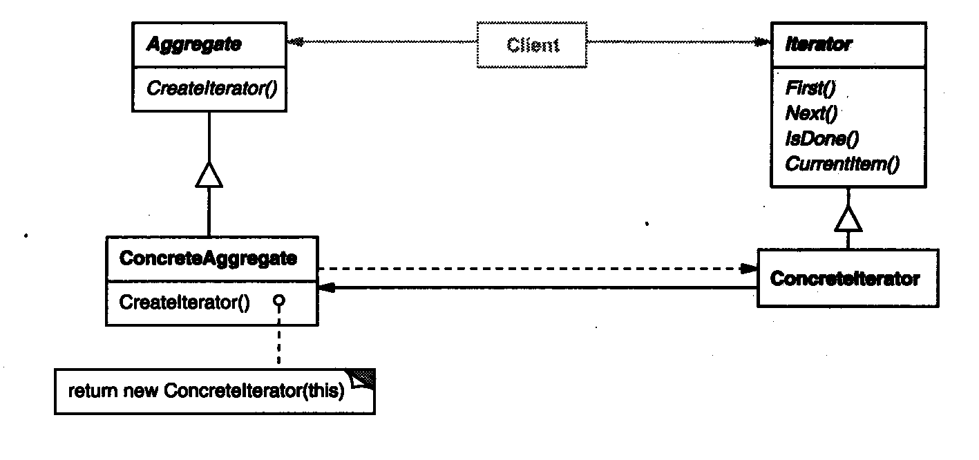 具体聚合(ConcreteAggregate):具体聚合实现创建相应迭代器的接口,该操作返回ConcreteIterator的一个适当的实例。