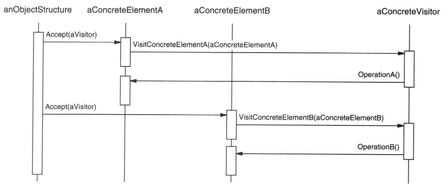 * 有时可以在 Visitor中提供一个缺省的实现,这一实现可以被大多数的ConcreteVisitor继承,
