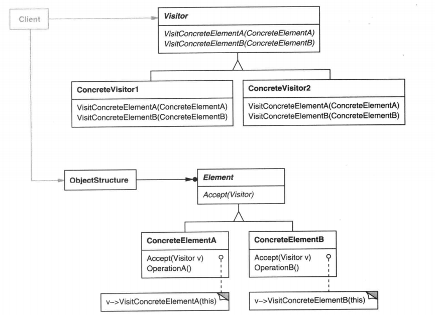 每个ConcreteElement类实现一个Accept操作,这个操作调用访问者中相应于本ConcreteElement类的Visit...的操作,这样最终得到调用的操作不仅依赖于该元素的类也依赖于访问者的类。
