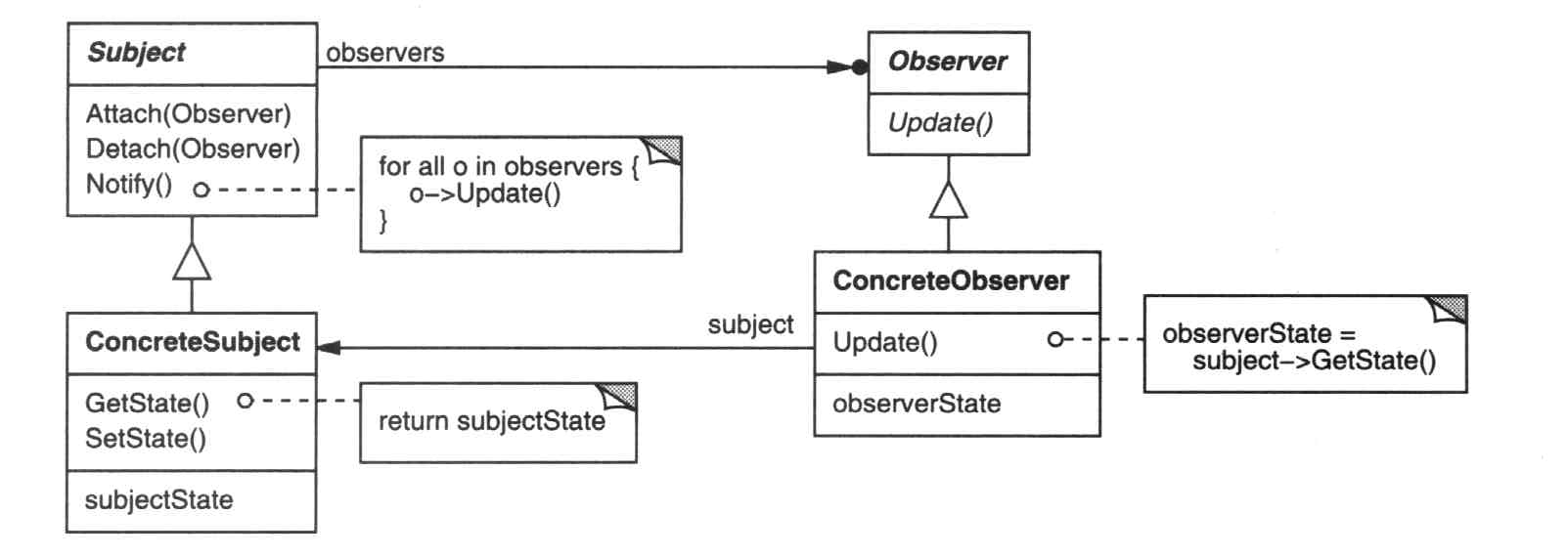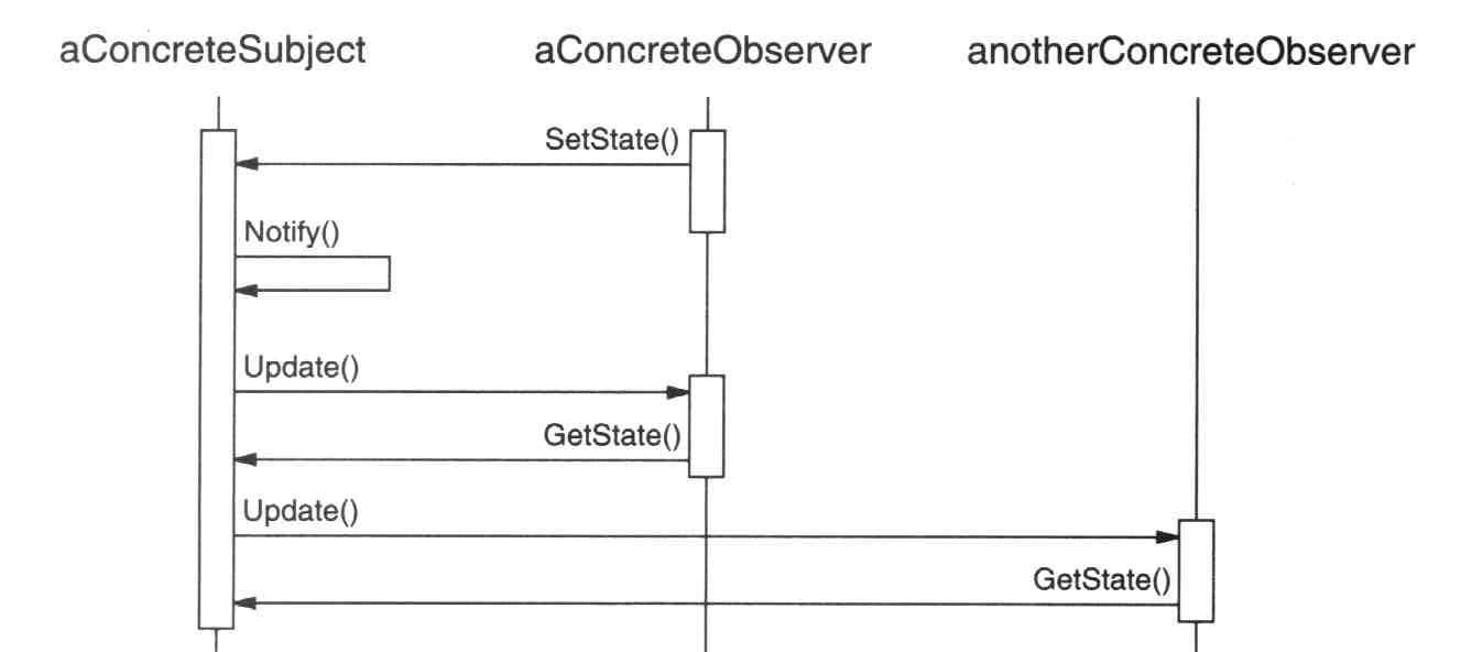 注意:发出改变请求的Observer对象并不立即更新,而是将其推迟到它从目标得到一个通知之后。Notify不总是由目标对象调用,它也可被一个观察者或其它对象调用。