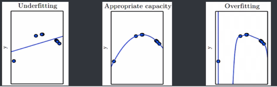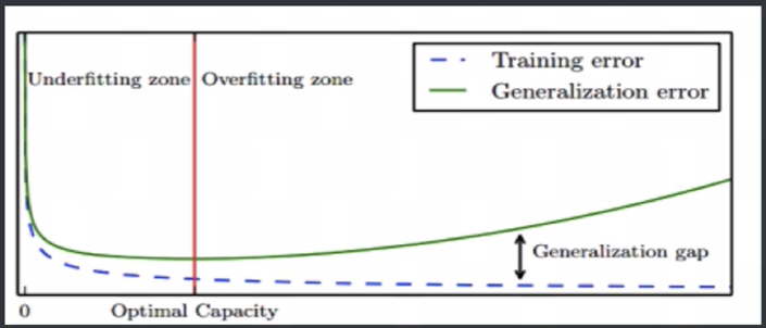 图中蓝色虚线为训练误差,绿色实现为泛化误差,选择泛化误差最小的位置(红色竖线处)即为模型选择的基本原则。其中红色竖线左边是欠拟合,右边是过拟合,随着拟合程度的增加,训练误差一直降低直至趋近于0,泛化误差先降低后增加,红色竖线处即为泛化误差最低点。
