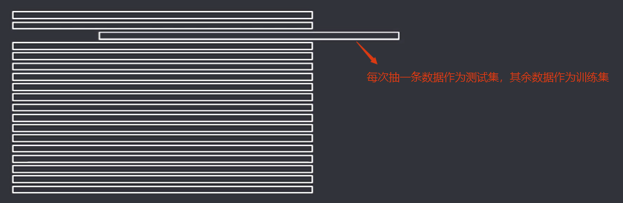 定义:是 k 折交叉验证的特殊形式,将数据集分成两个,其中一个数据集记录条数为 1,作为测试集使用,其余记录作为训练集训练模型。