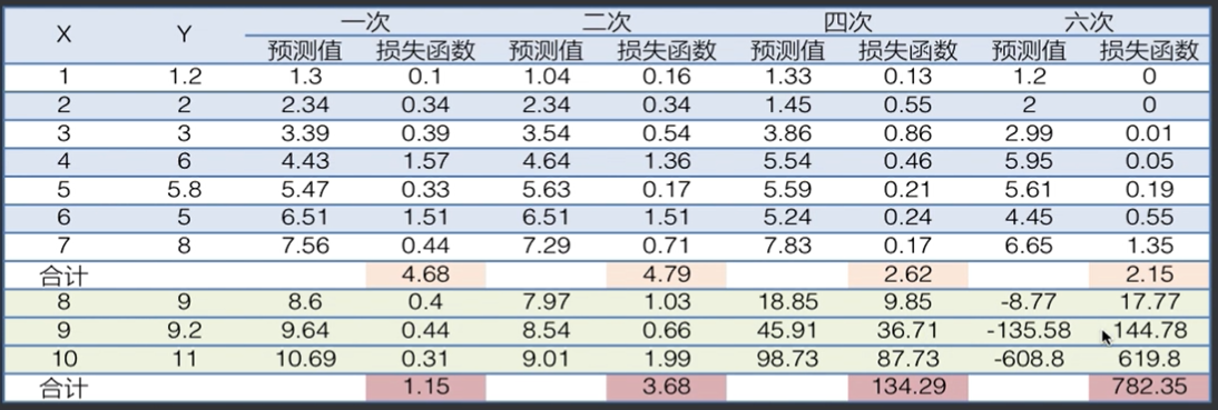 (R_{srm}(f_{六次模型})=\frac{1}{N}\sum_{i = 1}^{N}L(Y,f(x))+\lambda J(f)) =\frac{1}{7} \times 2.15 + 1\times(|-0.0289| + |0.732|+|-7.1972|+|34.933|+|- 86.574|+|103.14|)\approx232.91 得出结论:虽然六次模型的经验风险小于六次模型,但是六次模型因为多了很多参数导致结构化风险特别大,遇到新数据的时候风险也会很大,出现了过拟合的现象,所以在选择模型的时候此时优先选择一次模型。