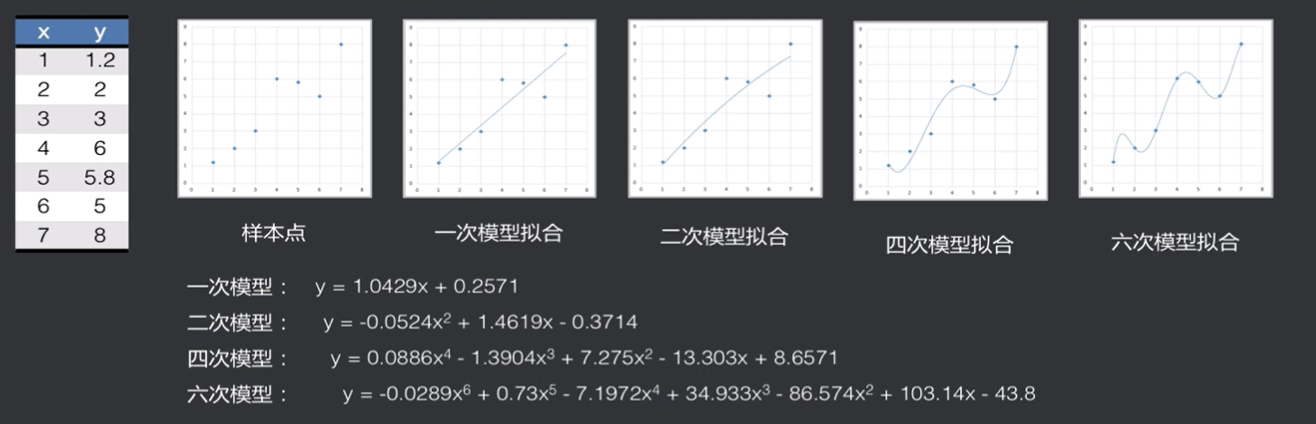已知7个点坐标数据作为训练集(x=1~7),分别对这些数据进行回归,得到几个模型如下图