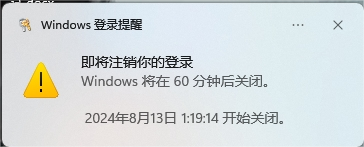 shutdown -s -t 延时关机秒数,此时右边就会弹出提示框如下